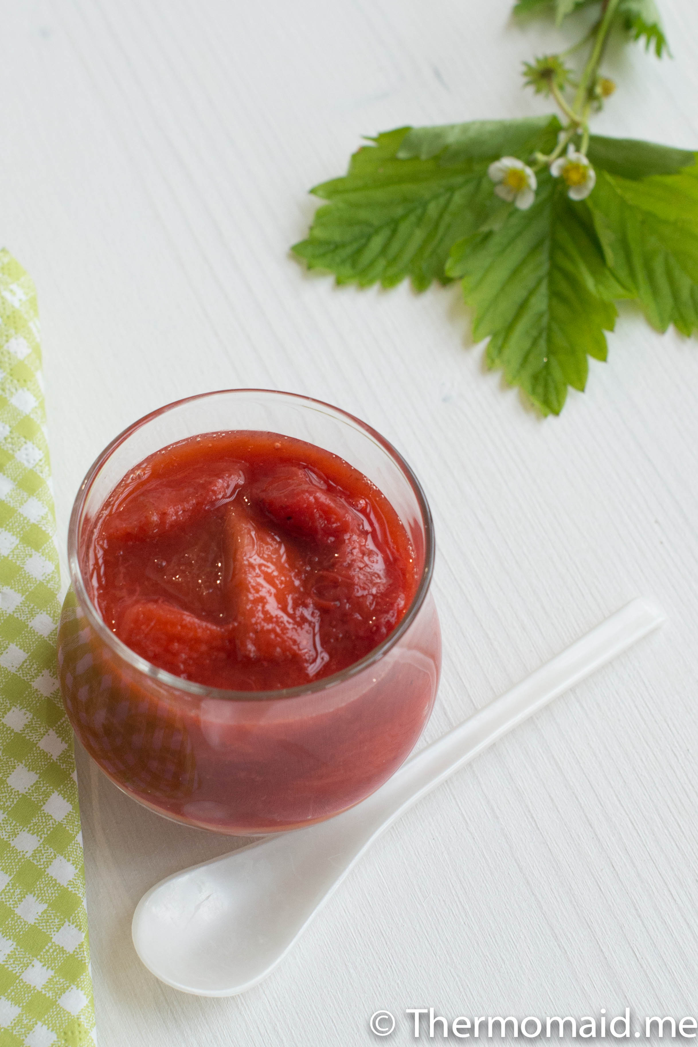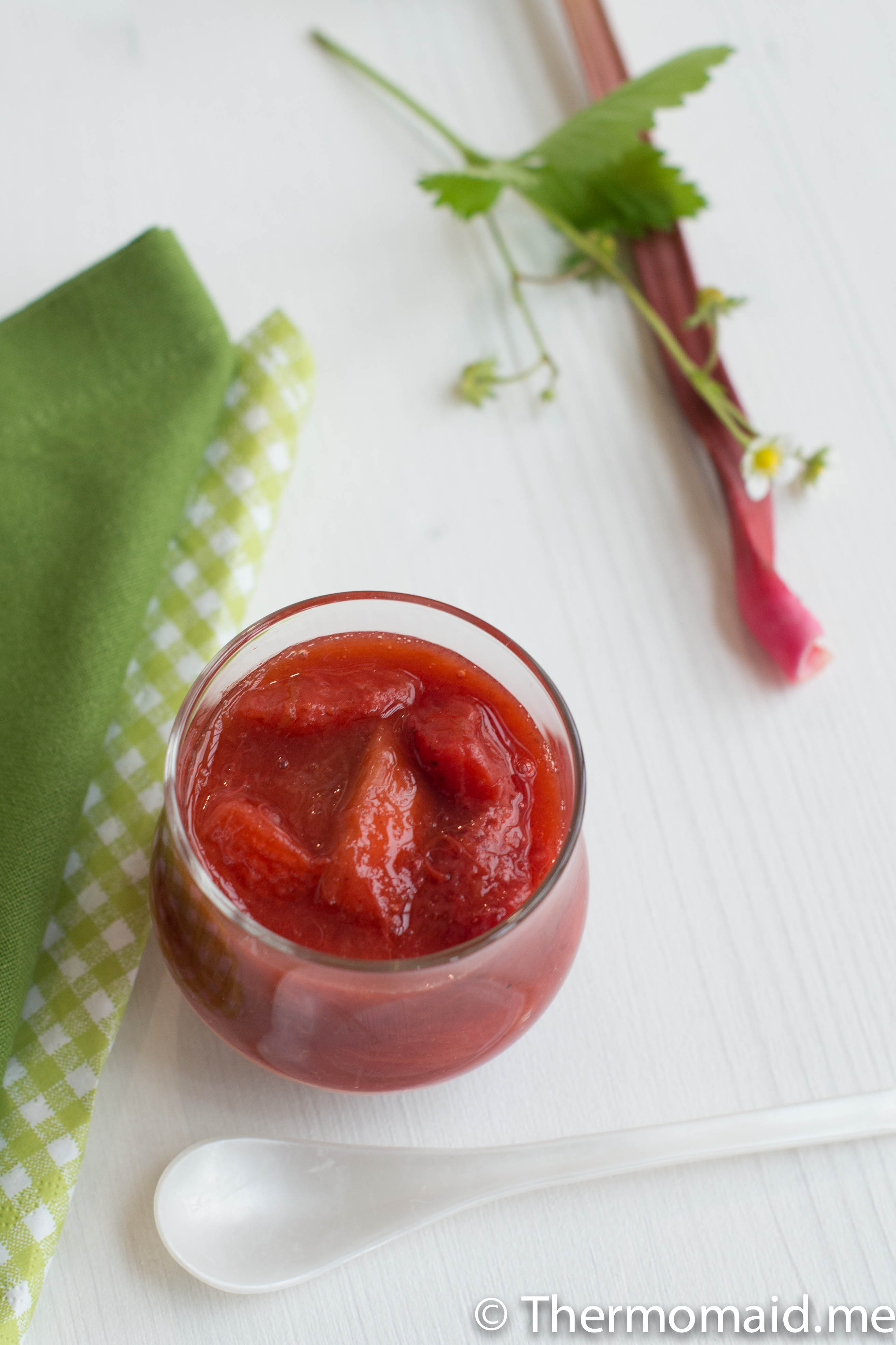 Ich weiß nicht warum, aber im Monat Mai ist es mir immer besonders wichtig, die Produkte der Saison zu verwenden – und das möglichst oft! Sobald die ersten geschmackvollen Erdbeeren auf dem Markt sind, bereite ich dieses Erdbeer-Rhabarber-Kompott zu. Leider (oder zum Glück?) bin ich die einzige in der Familie, die diese Kombo so richtig mag. Wenn ich mich richtig erinnere, war dies eines der ersten Rezepte, die ich mir für den Thermomix entwickelt habe! Also, los geht’s: