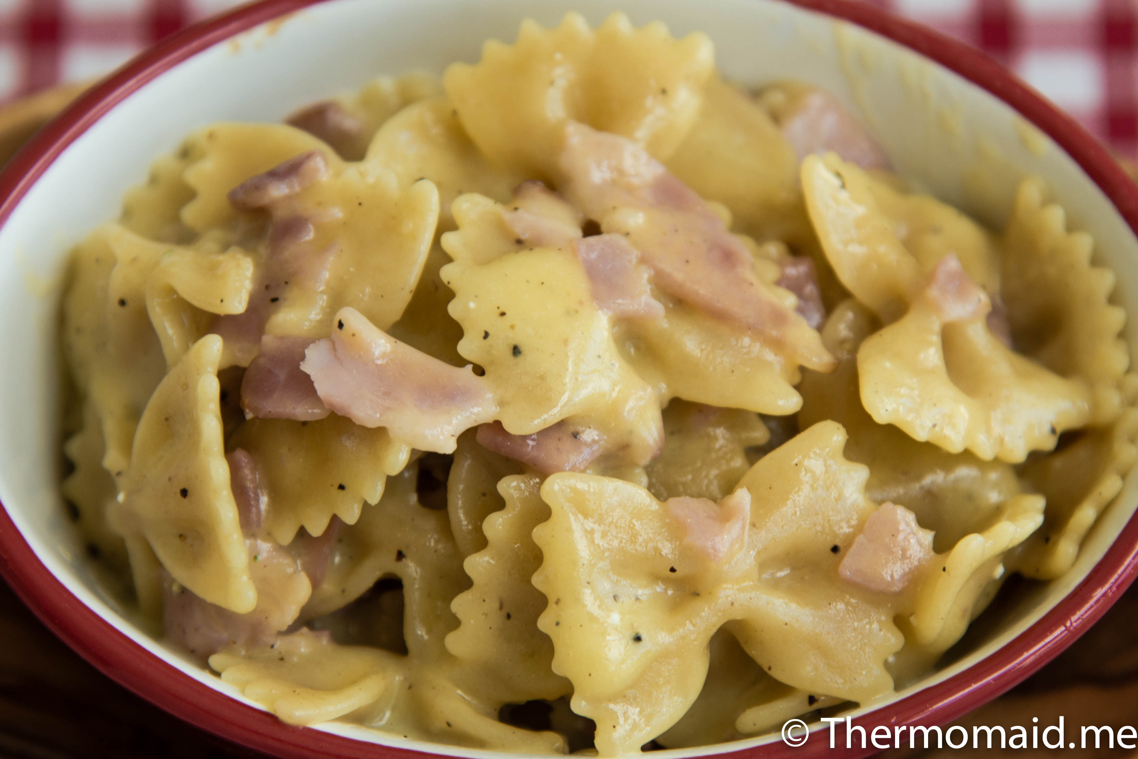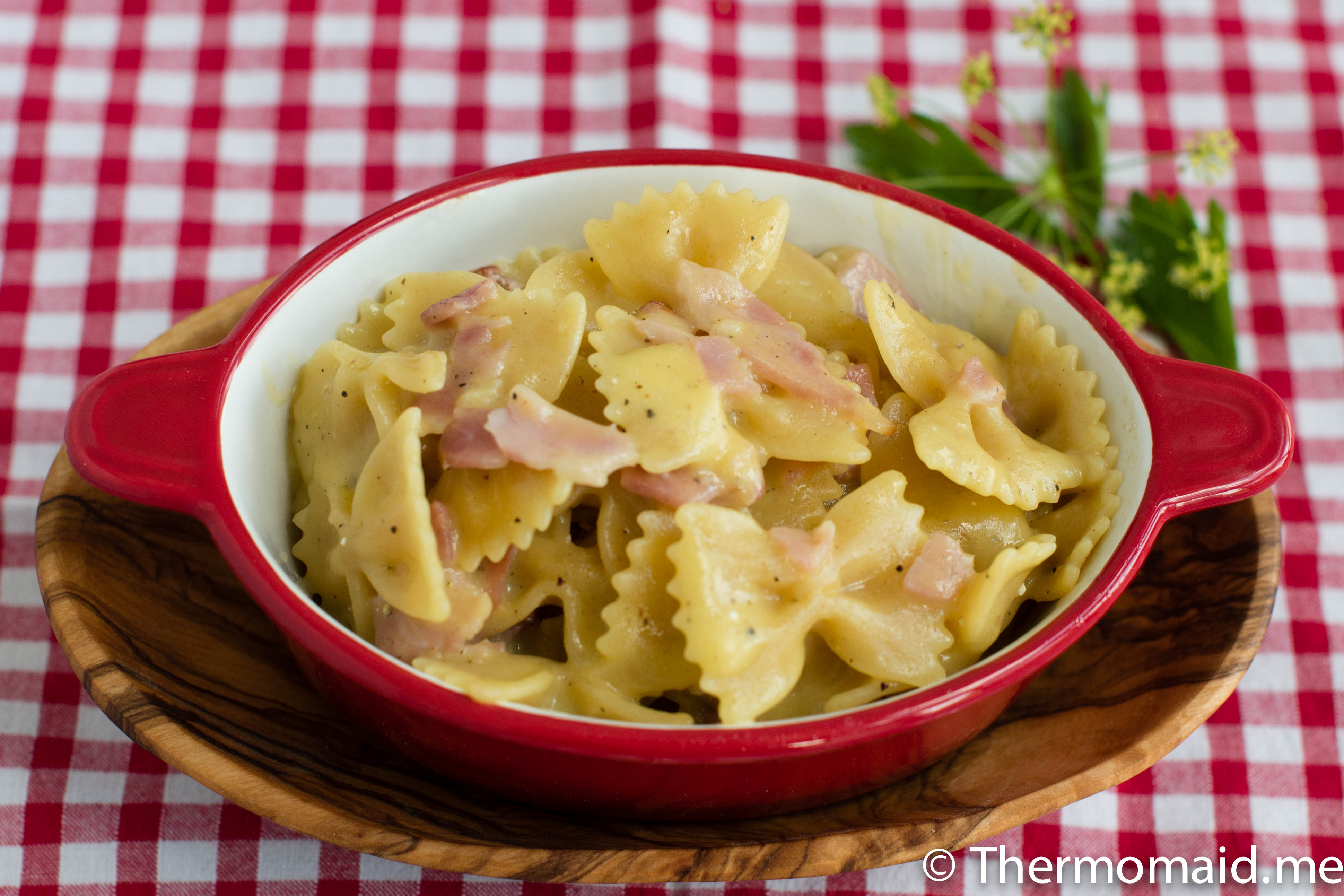 Die Bindung der Sauce übernimmt das Ei: schwer zu glauben, aber Nudelwasser plus Eigelb ergeben eine sämige, glänzende Sauce! Aber klar! Eiweiß beginnt bei 72 ° zu stocken… Und genau hier kann der Thermie wieder brillieren: durch die Temperaturkontrolle per Knopfdruck gibt es sicher keine Ei-Klümpchen! Alle Zutaten lassen sich bequem mithilfe unseres Helferleins abwiegen: einfach eine Schale auf den Mixtopf stellen, die Tara-Taste drücken und die Zutaten abwiegen. Wenn Du zu Beginn alles abgewogen bereitstellst, kannst Du kochen „wie ein TV-Koch“! ;-))