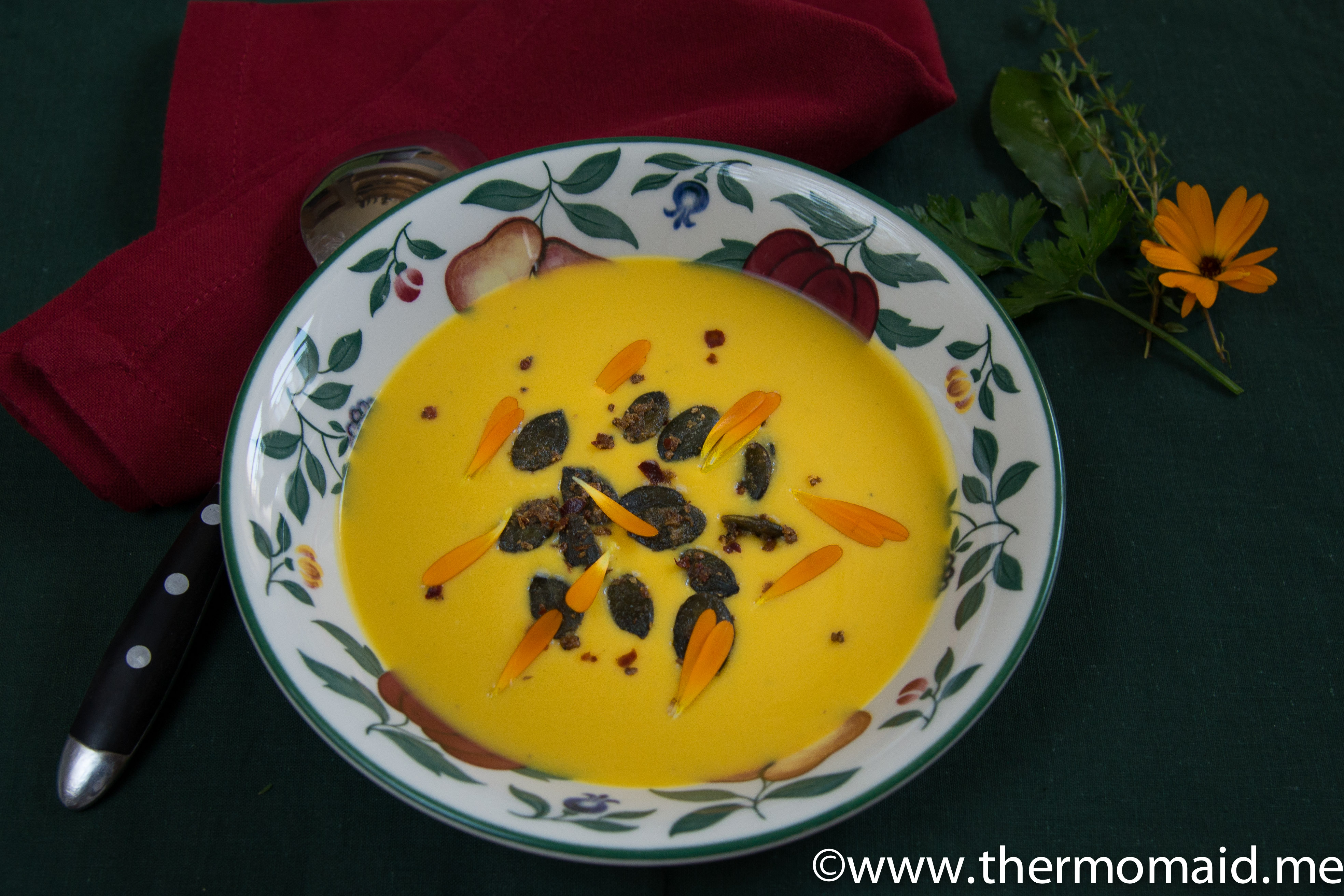 Jetzt geht’s zum Rezept: hierfür habe ich ein Rezept aus dem Buch „Avec Eric“ von Eric Ripert abgewandelt und TMX-tauglich gemacht. Ich habe Butternuss-Kürbis verwendet und finde, der Geschmack der Suppe ist sehr „clean“. Die Kräuter unterstützen das Aroma und müssen vor dem Pürieren nicht herausgefischt werden, da sie vollkommen verschwinden. Die Obersmenge habe ich stark reduziert und könnte auch ganz weggelassen werden. Die Fettmoleküle wirken aber als Geschmacksträger und sorgen für ein cremig-volles Gaumengefühl! – der Kürbis hat ja eh‘ schon wenig Energiegehalt… ;-)) Bestreut habe ich die Suppe – wie im Originalrezept – mit würzigen Kürbiskernen für etwas „Biss“und extra Würzkick sowie ausgezupften Ringelblumen-Blütenblättern aus dem Garten. Ich habe festgestellt, dass der Kürbisgeschmack am besten herauskommt, wenn man die Suppe nicht unbedingt kochend heiß serviert, sondern am besten am unteren Ende der Skala „heiß“. Auch kalt – z.B. in einem Shot-Glas serviert – schmeckt sie nicht schlecht!