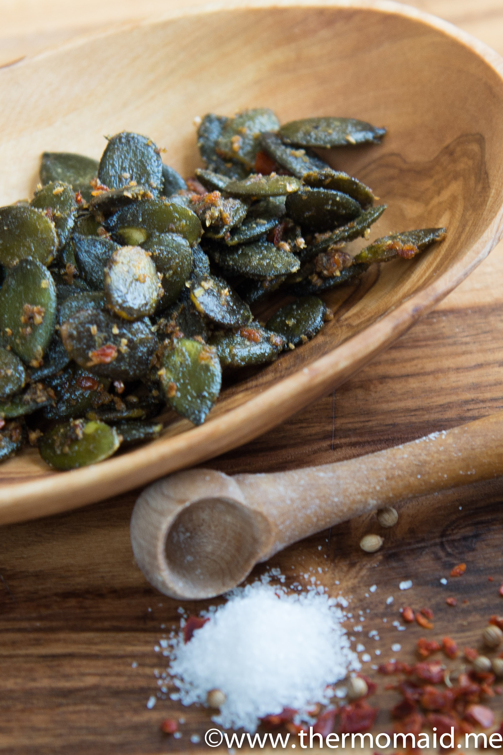 Die Kürbiskerne schmecken zum Beispiel gut über (m)eine Kürbiscreme-Suppe gestreut. Das gibt „Biss“ und extra Würze. Die übrig gebliebenen Kerne einfach am Abend zum Gläschen Wein naschen, in den nächsten Tagen über einen Salat streuen oder gleich die doppelte Menge als Geschenk herstellen!